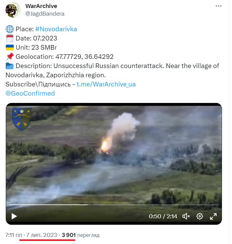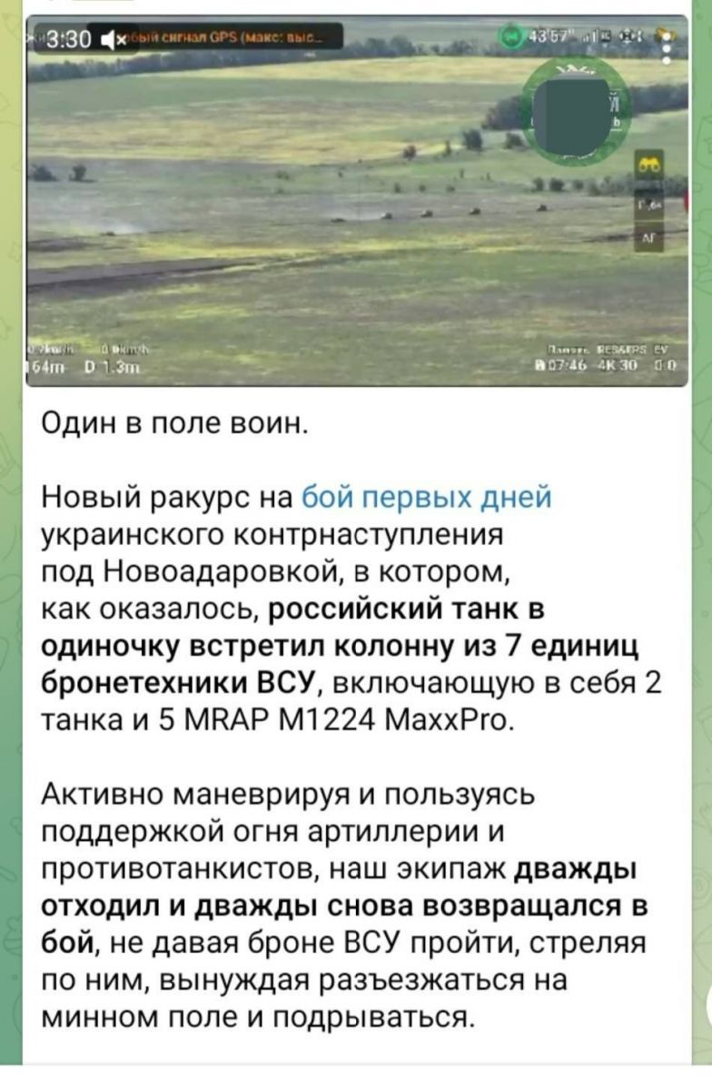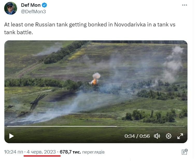 Так, вчора, 29 липня на російських каналах почали розкручуватися кадри бою їхніх танкістів, котрі начебто самотужки «зупинили наступ української бронегрупи». Насправді це відео показує момент боїв за Новодарівку Запорізької області, яку Сили оборони звільнили доволі швидко ще на початку червня 2023 року.