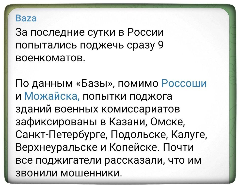 https://racurs.ua/n185709-devyat-popytok-podjogov-voenkomatov-za-sutki-zafiksirovali-v-rf.htmlРакурсДев’ять спроб підпалів військкоматів лише за останню добу зафіксували на території країни-агресора росії.