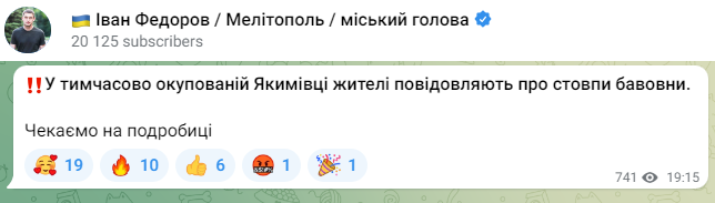У тимчасово окупованій Якимівці жителі повідомляють про стовпи бавовни. Чекаємо на подробиці, — написав Федоров.