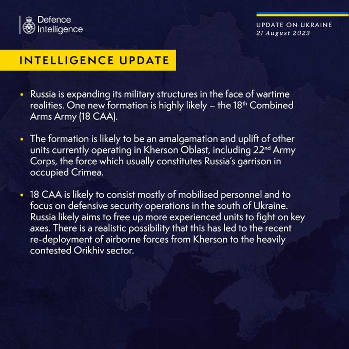Ворог створює нове військове формування — 18-ту загальновійськову армію. Формування, ймовірно, буде об'єднанням та посиленням інших частин, що діють нині у Херсонській області, включаючи 22-й армійський корпус, який зазвичай складає російський гарнізон в окупованому Криму. Про це Міністерство оборони Великої Британії повідомило в Twitter.
