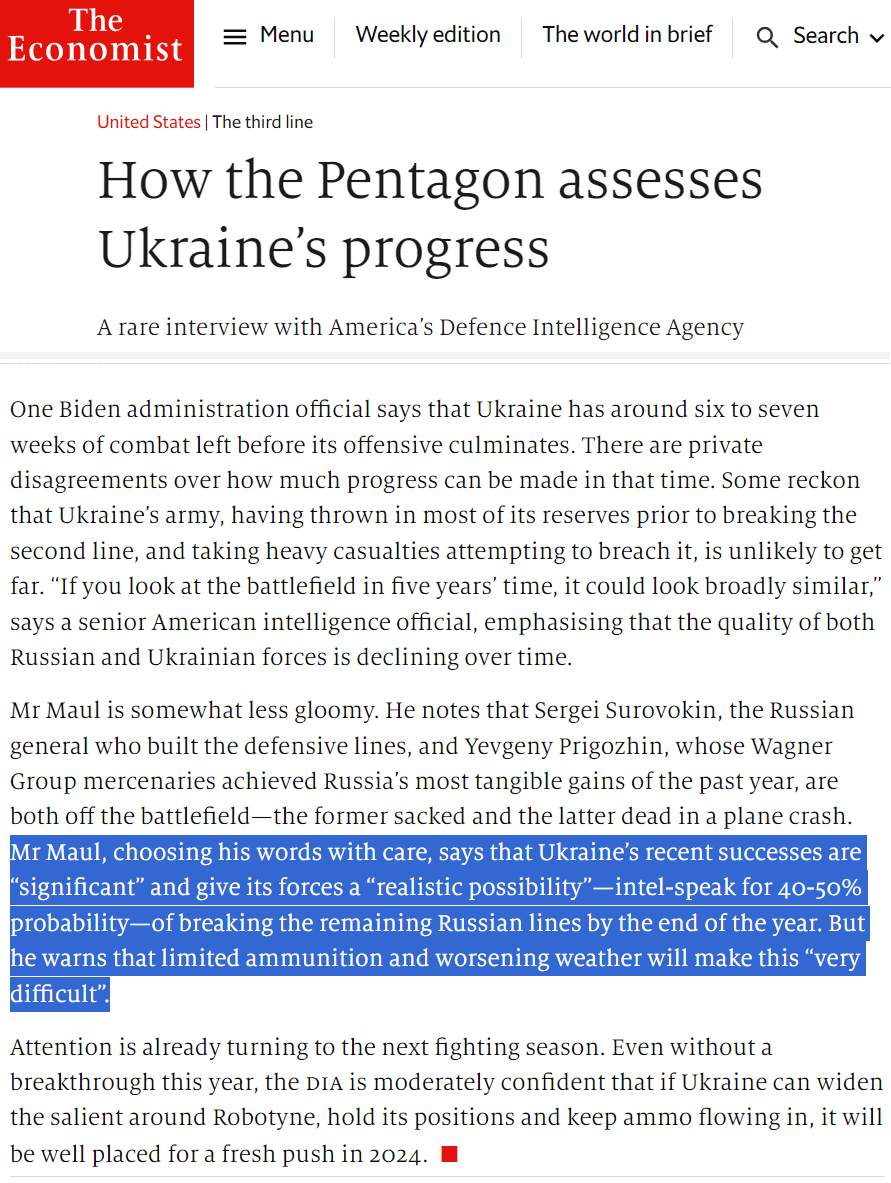Американська розвідка вказує, що ЗСУ зможуть прорвати решту російських рубежів до кінця року з ймовірністю у 40−50%. Проте обмеженість боєприпасів і погіршення погоди зроблять це «дуже складним».