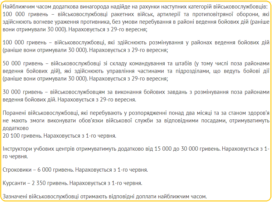 Додаткова винагорода надійде на рахунки наступних категорій військових: