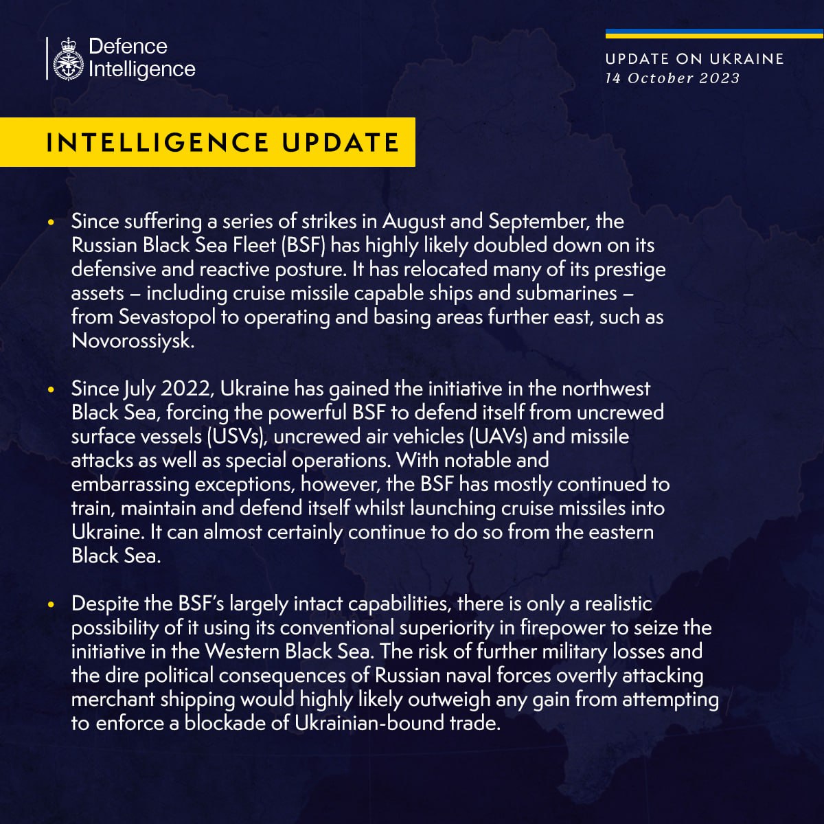 Після низки ударів ЗСУ у серпні та вересні по кораблях, ворог швидше за все подвоїв свою оборону. Крім того, росія була змушена перебазувати частину своїх кораблів та субмарин з окупованого Криму до Новоросійська. Також агресор змушений захищатися від надводних дронів, атак безпілотників та ракетних ударів України. Про це 14 жовтня Міністерство оборони Великої Британії у Twitter.
