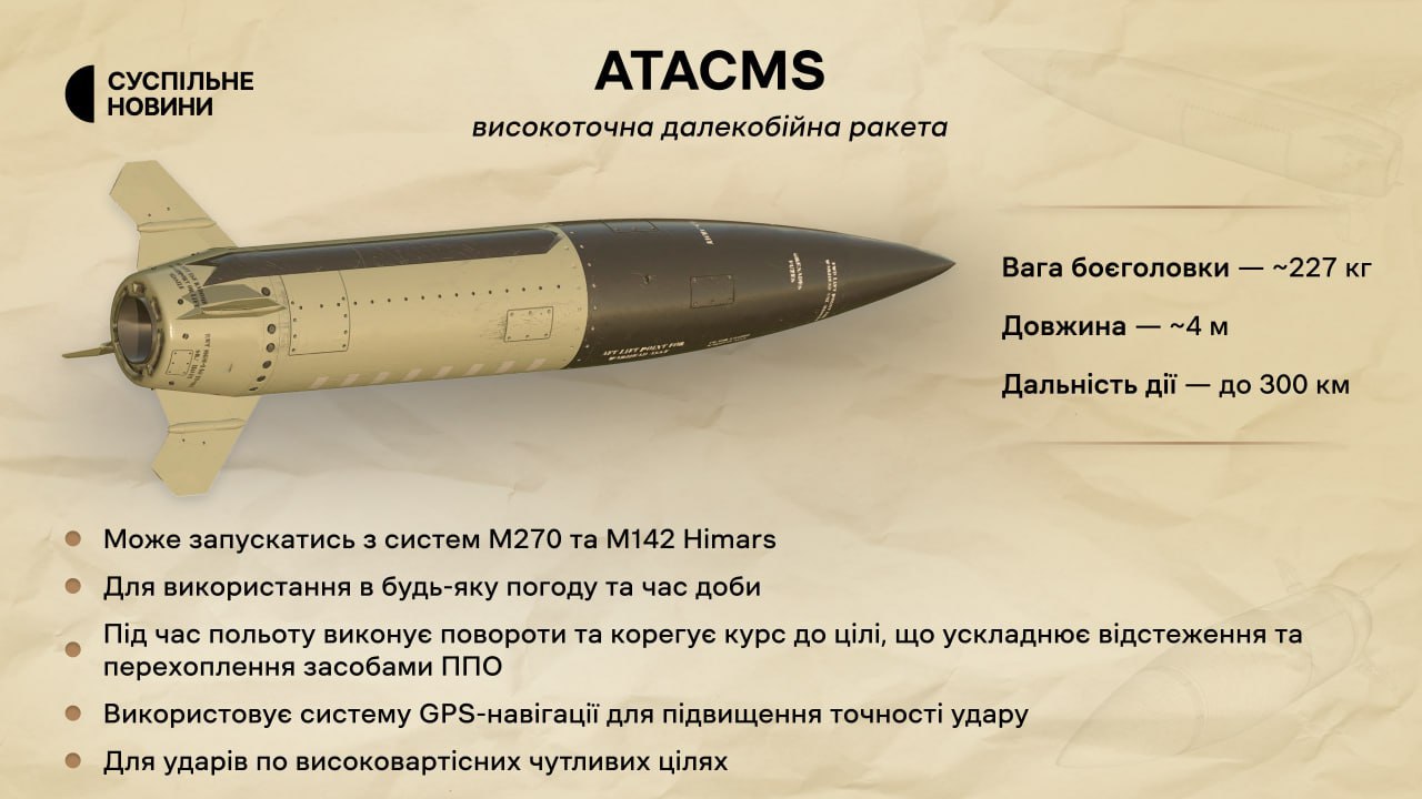 https://racurs.ua/n188401-skorost-padeniya-3-5-tys-km-ch-chto-izvestno-o-ballisticheskih-raketah-atacms.htmlРакурсATACMS — далекобійна високоточна балістична ракета, яка може вражати цілі на відстані до 300 кілометрів. Після пострілу вона здіймається вгору і далі, розганяючись, б'є по цілі майже вертикально. Швидкість падіння ATACMS понад 3,5 тис. км за годину.