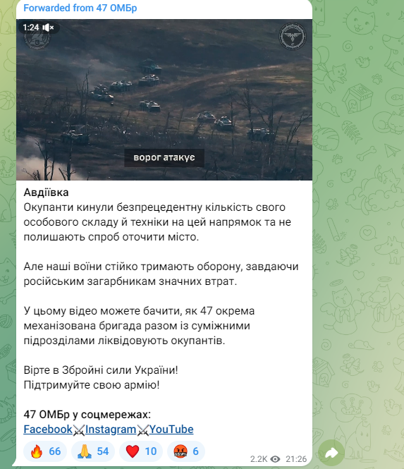 Нагадаємо, після очікуваного провалу російського «бліцкригу» в Авдіївці, армія рф перейшла до тактики штурму «м'ясними» хвилями. Якщо на одній ділянці нічого не виходить — ворог зміщує удар на відстань від 1 до 3 км. Захисники України очікують початку третьої хвилі атак на Авдіївку.
