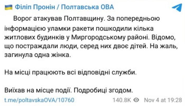 За попередньою інформацією уламки ракети пошкодили кілька житлових будинків у Миргородському районі. Відомо, що постраждали люди, серед них двоє дітей. На жаль, загинула одна жінка, — розповів Пронін.