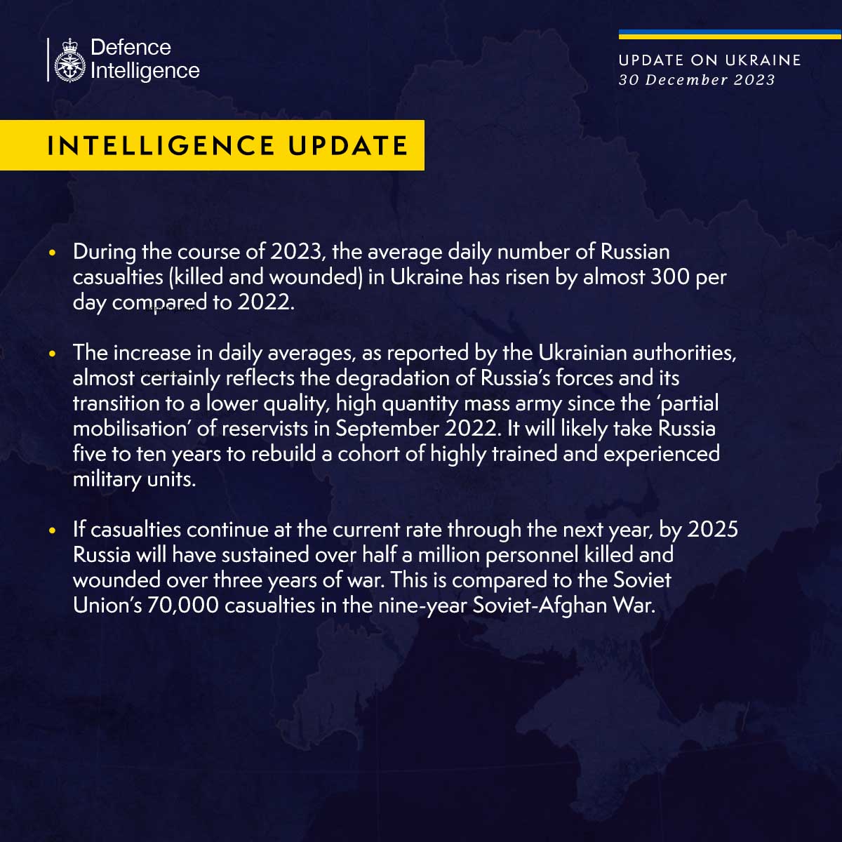 У 2023 році середні щоденні втрати росіян в особовому складі, вбитими й пораненими, зросли до майже 300 на день, що більше, ніж торік. Якщо темпи щоденних втрат рф у війні з Україною будуть постійними, то до 2025 року країна-агресор втратить щонайменше вбитими та пораненими 500 тис. солдатів, офіцерів та найманців. Про це 30 грудня Міністерство оборони Великої Британії повідомило у соцмережі X.