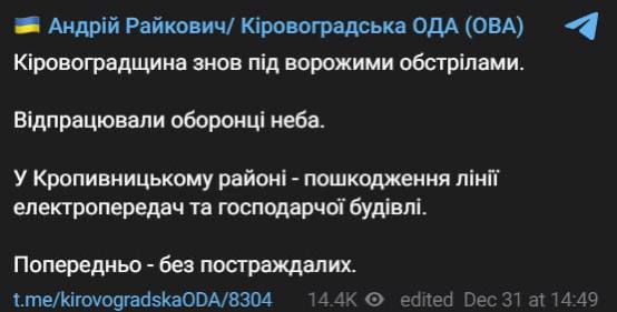 Про це 31 грудня повідомив голова Кіровоградської ОВА Андрій Райкович.