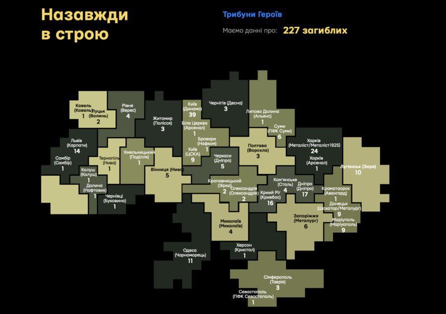 https://racurs.ua/n192120-v-ukraine-poschitali-poteri-futbolnyh-ultras-na-voyne-s-rossiey.htmlРакурсСтаном на 1 лютого 2024 року на війні з росією загинуло 227 футбольних фанатів.