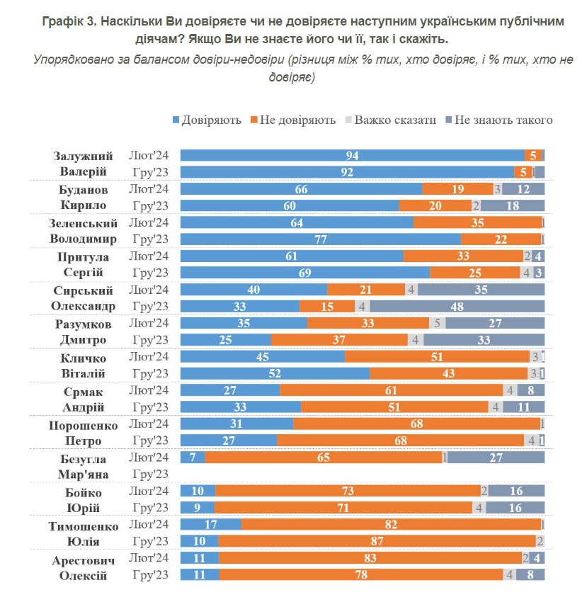 Щодо колишнього головкома ЗСУ Валерія Залужного — у нього найвищий рівень довіри у суспільстві. Йому довіряють 94% українців, не довіряють лише 5%. При цьому довіра до екс-головкома у лютому збільшилася на 2%, якщо порівнювати з опитуванням грудня 2023 року.