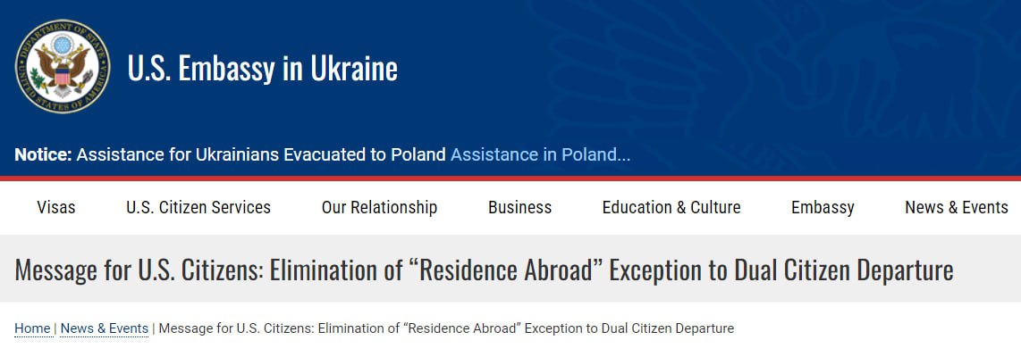 Посольство США в Україні опублікувало реліз, в якому попередило своїх громадян, що Україна скасовує виняток, який раніше дозволяв деяким українцям віком від 18 до 60 років залишати країну. Після цієї зміни американсько-українські подвійні громадяни, включно з тими, хто проживає в Сполучених Штатах, можуть більше не мати змоги залишити Україну.