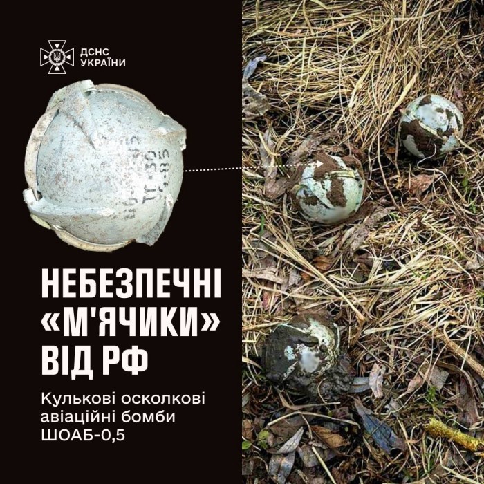 https://racurs.ua/n196256-rossiya-distancionno-minuet-ukrainu-aviabombami-pohojimi-na-nebolshie-myachiki-foto.htmlРакурсРосійські загарбники дистанційно мінують Україну кульковими осколковими авіаційними бомбами ШОАБ-0,5.