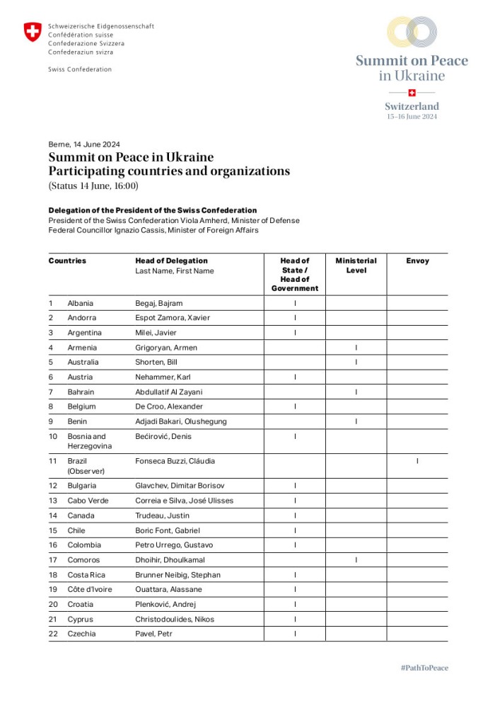 Вчора влада Швейцарії оприлюднила перелік учасників саміту.