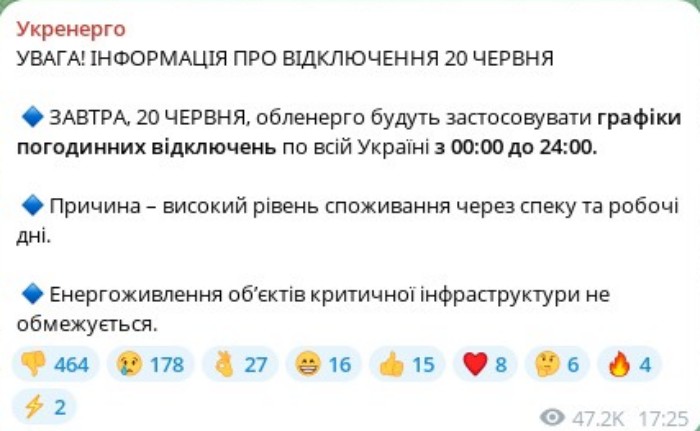 https://racurs.ua/n196478-grafiki-otklucheniy-20-iunya-budut-primenyat-na-protyajenii-vseh-sutok-ukrenergo.htmlРакурсВ Україні завтра, 20 червня, обленерго будуть застосовувати графіки погодинних відключень впродовж усієї доби — з 00.00 до 24.00.