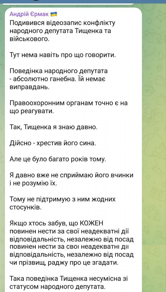 Так, Тищенка я знаю давно. Дійсно — хрестив його сина. Але це було багато років тому. Я давно вже не сприймаю його вчинки і не розумію їх. Тому не підтримую з ним жодних стосунків. Якщо хтось забув, що КОЖЕН повинен нести за свої неадекватні дії відповідальність, незалежно від посад чи прізвищ, раджу про це згадати. Така поведінка Тищенка несумісна зі статусом народного депутата, — написав Єрмак.