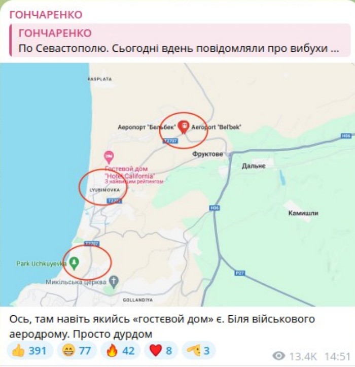 Народний депутат України Олексій Гончаренко, коментуючи цю новину у своєму Telegram-каналі, наголосив, що ці пляжі розташовані за декілька кілометрів від військового аеродрому Бельбек.