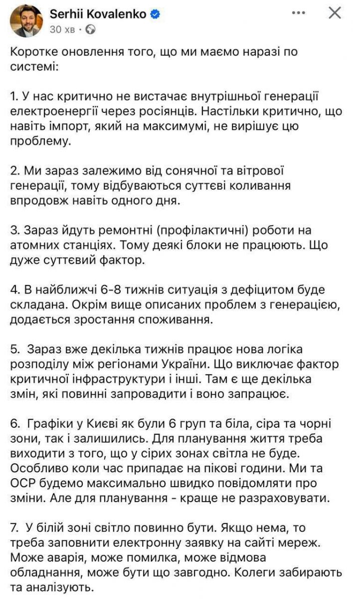 Йдеться про зростання споживання, ремонт енергоблоків АЕС, залежність від вітрової та сонячної генерації і, перш за все, обстріли рашистів. Про них попередив гендиректор YASNO Сергій Коваленко.