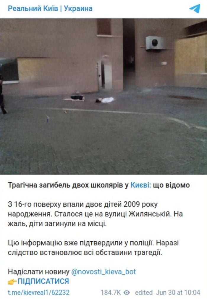 Зазначається, що у соцмережах з’явилися фото з місця інциденту. Стверджується, що подія сталася на вулиці Жилянській, обоє загиблих — 2009 року народження.