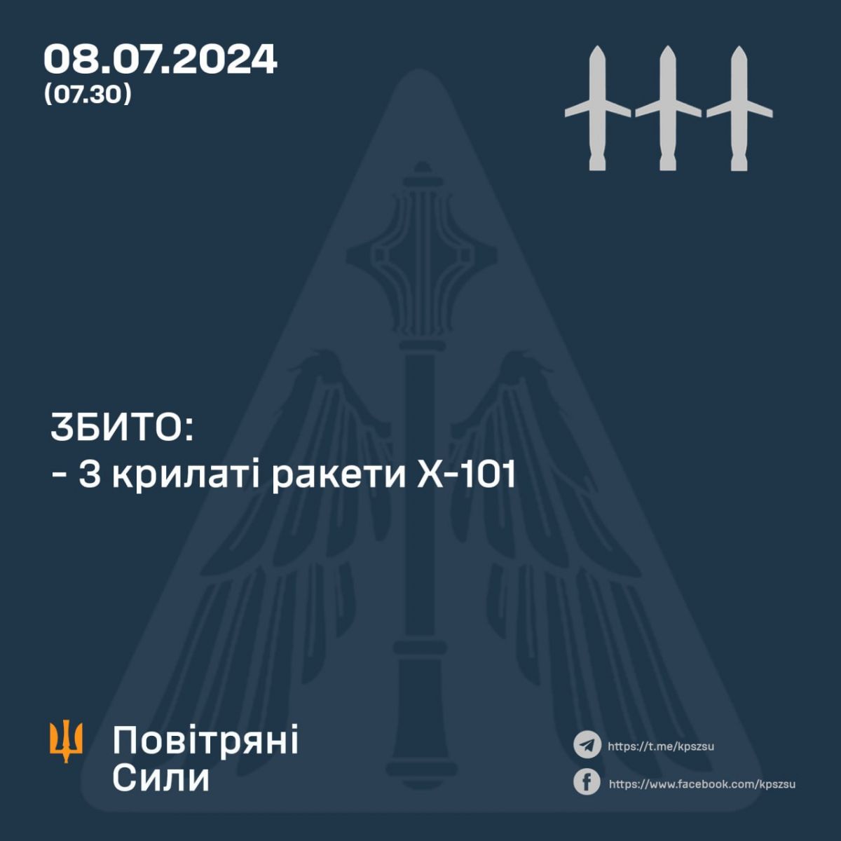 У ході бойової роботи протиповітряною обороною було знищено три крилаті ракети Х-101. Повітряні цілі ліквідували у Житомирській та Черкаській областях.