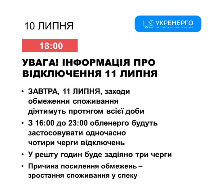 https://racurs.ua/n197161-grafiki-otklucheniy-11-iulya-budut-deystvovat-na-protyajenii-vseh-sutok-ukrenergo.htmlРакурсВ Україні завтра, 11 липня, заходи обмеження споживання електроенергії діятимуть протягом всієї доби.