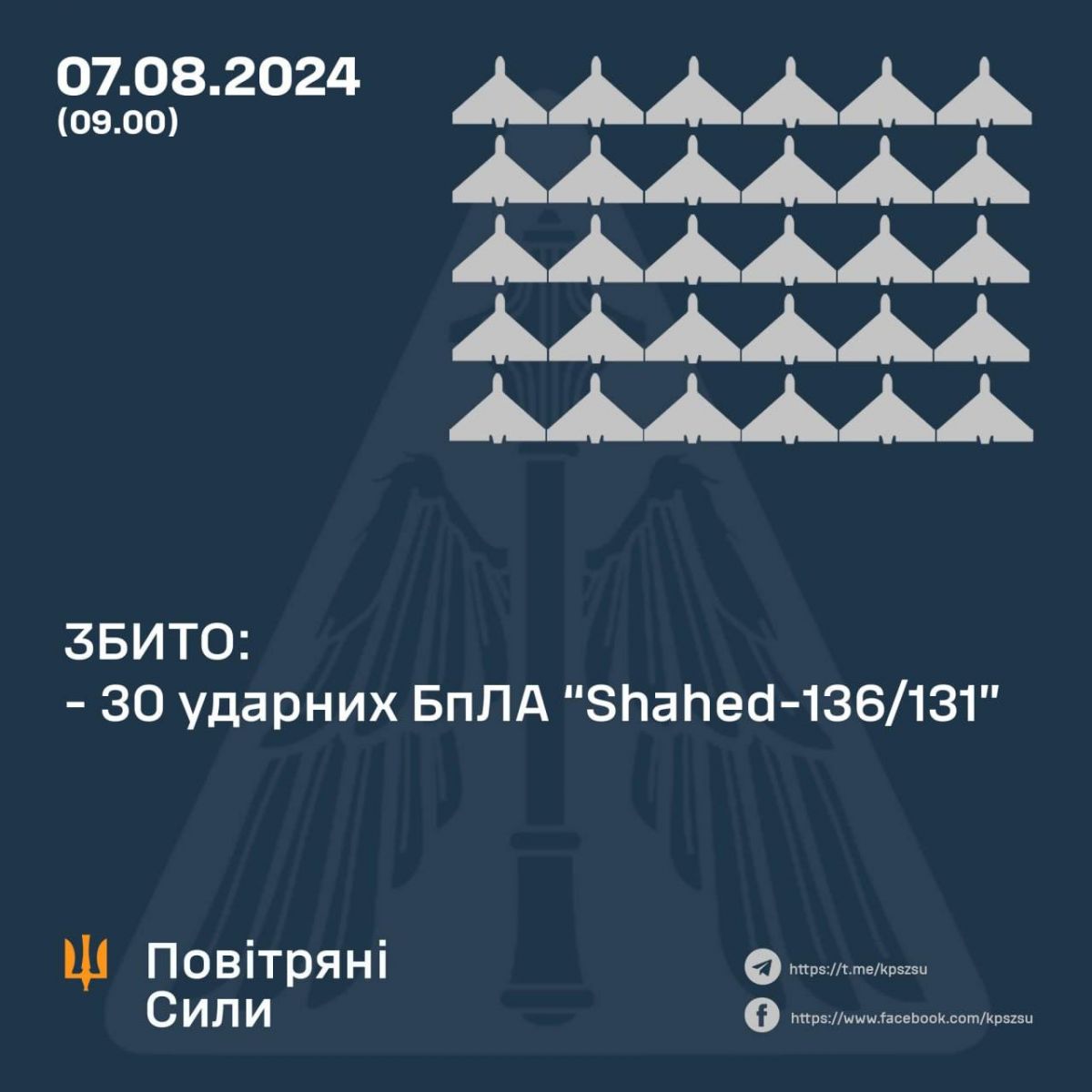 https://racurs.ua/n198057-pvo-sbila-v-semi-oblastyah-ukrainy-vse-30-shahedov.htmlРакурсПовітряні сили повідомили, що у ніч на 7 серпня збила усі 30 запущених російськими нацистами «шахедів».