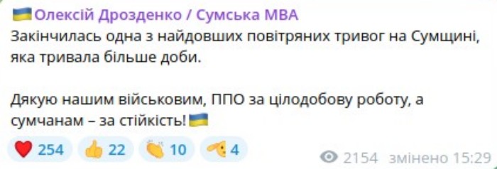 Закінчилась одна з найдовших повітряних тривог на Сумщині, яка тривала більше доби, — зазначив він. — Дякую нашим військовим, ППО за цілодобову роботу, а сумчанам — за стійкість!