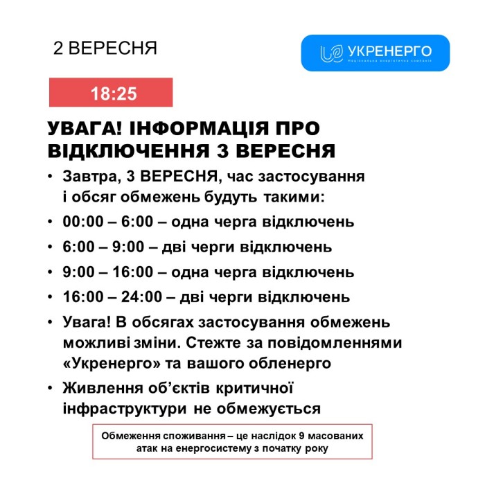 https://racurs.ua/n198905-odnu-dve-ocheredi-otklucheniy-budut-primenyat-3-sentyabrya-ukrenergo.htmlРакурсВ Україні завтра, 3 вересня, застосовуватимуть одночасно одну чи дві черги відключень.