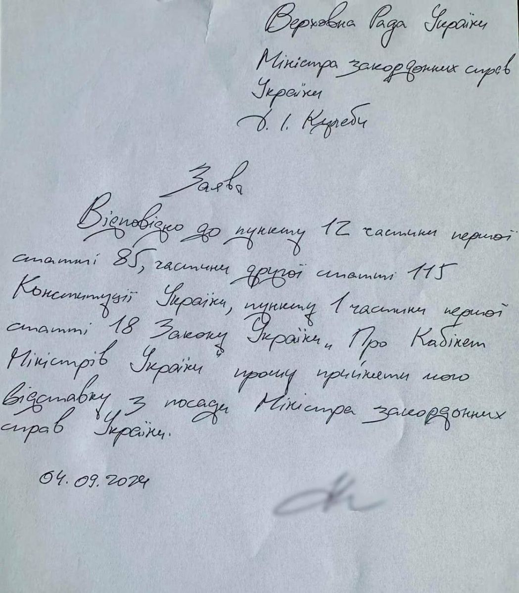 Министр иностранных дел Кулеба подал заявление об отставке