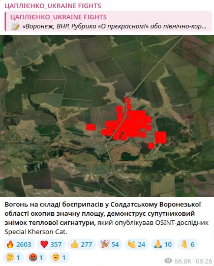 https://racurs.ua/n199054-pod-voronejem-posle-ataki-bespilotnikov-vspyhnul-sklad-boepripasov-video.htmlРакурсУ росії поблизу Воронежа внаслідок атаки безпілотника спалахнула пожежа на складі боєприпасів, влада оголосила евакуацію кількох сіл.