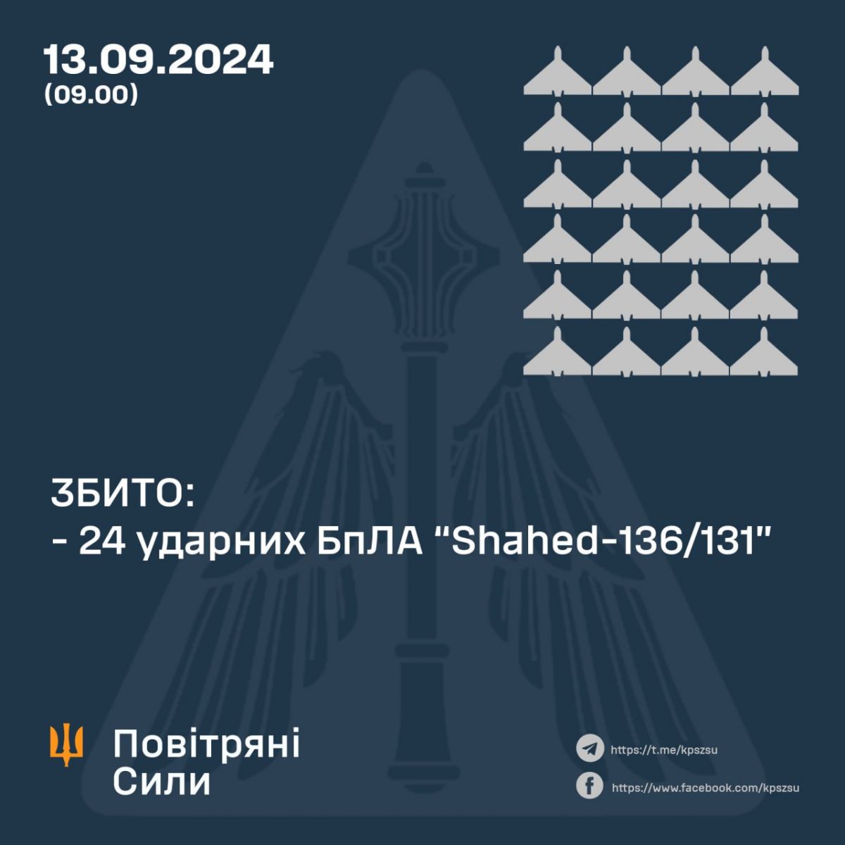 https://racurs.ua/n199243-pvo-sbila-nochu-nad-pyatu-oblastyami-24-26-shahedov.htmlРакурсУ ніч на 13 вересня 2024 року противник атакував 26-ма ударними БпЛА типу Shahed.