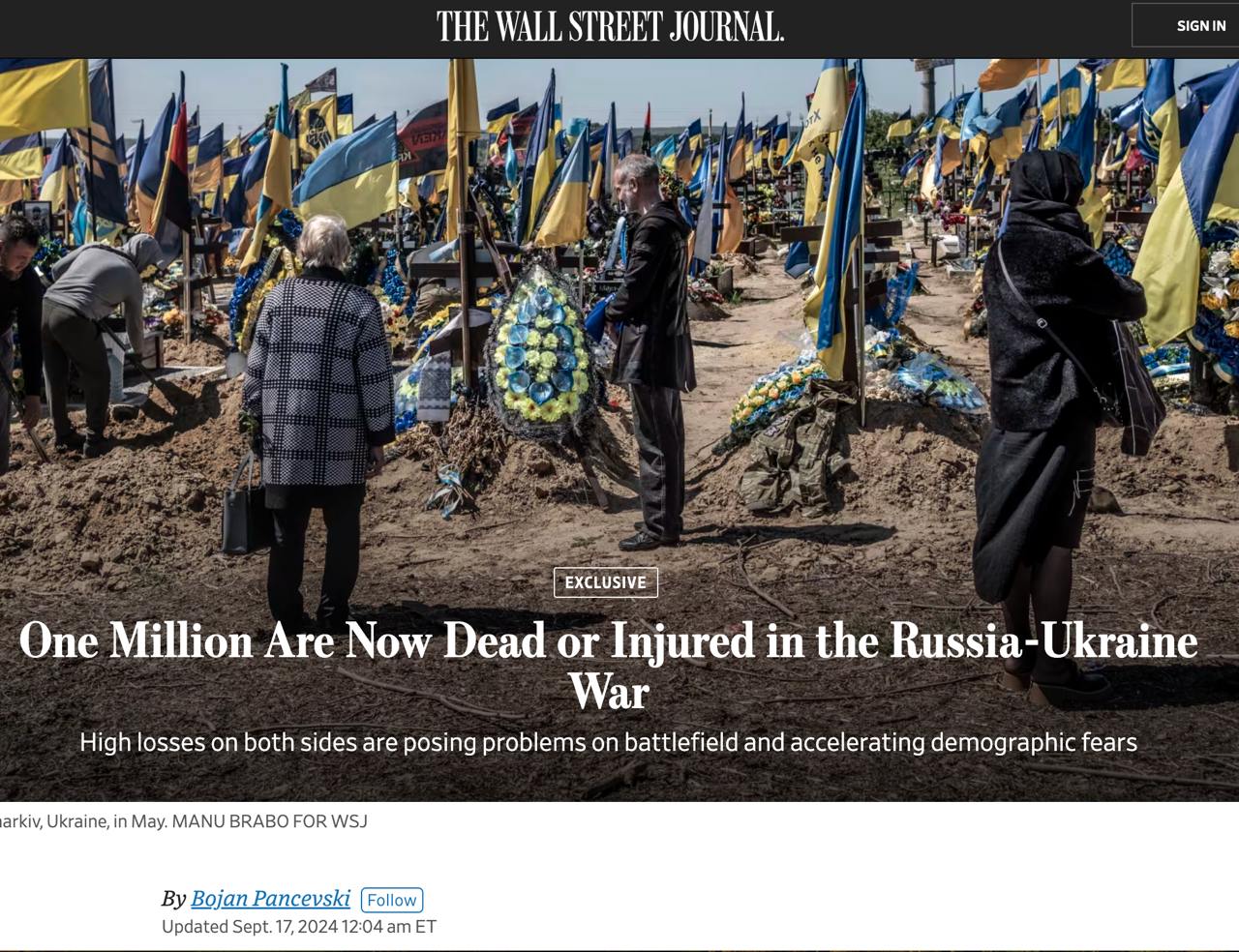 https://racurs.ua/n199374-the-wall-street-journal-ocenilo-poteri-ukrainy-i-rossii-na-voyne.htmlРакурсВтрати України та росії на війні сягнули 1 мільйона людей вбитими і пораненими.