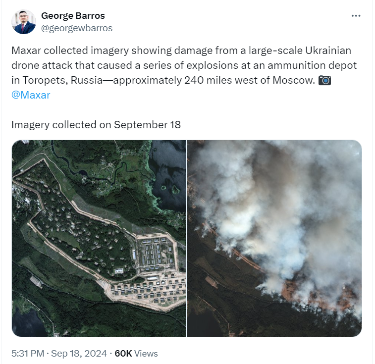 Нагадаємо, у ніч на 18 вересня російські ЗМІ писали про масовану атаку БПЛА у місті Торопець Тверської області. Місцева влада евакуйовувала населення з території, де працювала ППО і була пожежа. Пізніше очевидці повідомили про атаку складу із боєприпасами.