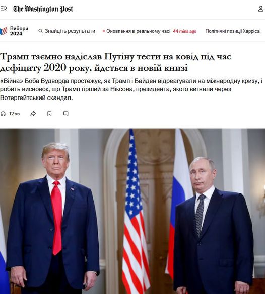https://racurs.ua/n200049-tramp-tayno-posylal-putinu-testy-na-koronavirus-i-sozvanivalsya-s-nim-v-nachale-2024-goda.htmlРакурсТрамп таємно надсилав владіміру путіну американські тести на коронавірус у 2020 році, коли ті були у дефіциті, пише книзі «Війна» журналіст Washington Post Боб Вудворд.