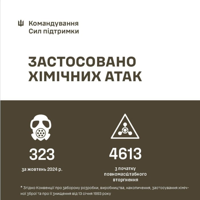 Зазначається, що з лютого 2023 року застосування росіянами небезпечних хімічних речовин набуло системного характеру. Загалом зафіксовано 4 тис. 613 застосувань ворогом боєприпасів, споряджених небезпечними хімічними речовинами.