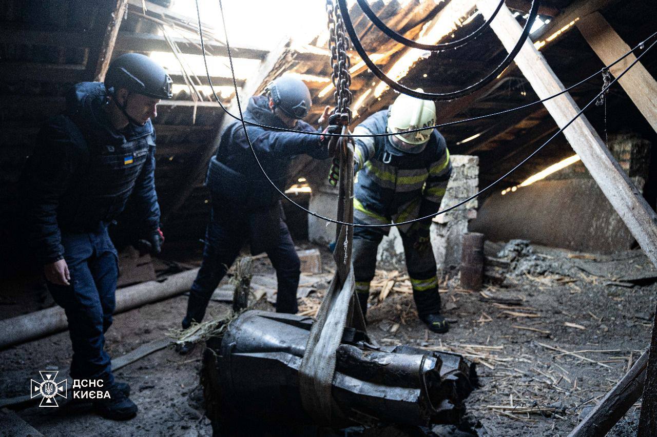 За допомогою крану, надзвичайники столиці разом із піротехнічним підрозділом мобільного рятувального центру швидкого реагування ДСНС України вилучили частину ракети, яка влучила в житлову п’ятиповерхівку внаслідок ранкової атаки.