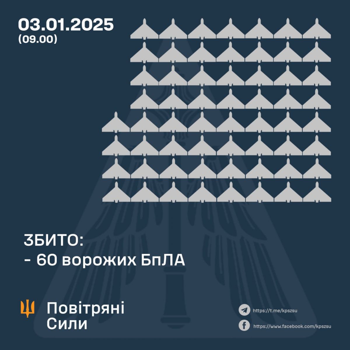 https://racurs.ua/n202773-nochu-nad-ukrainoy-sbili-60-iz-93-rossiyskih-bespilotnikov.htmlРакурсУ ніч з 2 на 3 січня над Україною збили 60 російських безпілотників.
