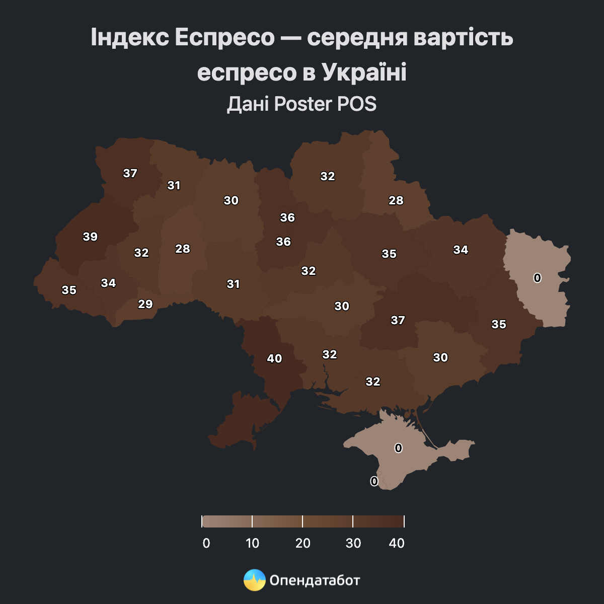 Найбільше за рік — аж на 29% — зросла ціна на Вінниччині: до 31 грн за філіжанку. Лише на Харківщині вартість порції еспресо залишилась без змін — 34 грн.