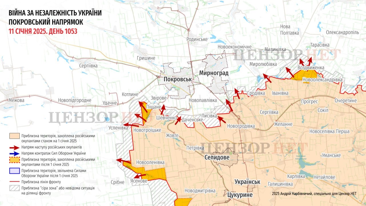 Як йдеться в аналізі, кадри з геолокацією, опубліковані 12 січня, свідчать, що російські війська нещодавно просунулися на схід від Мирного (на схід від Покровська) і захопили позиції вздовж траси Т-0504.