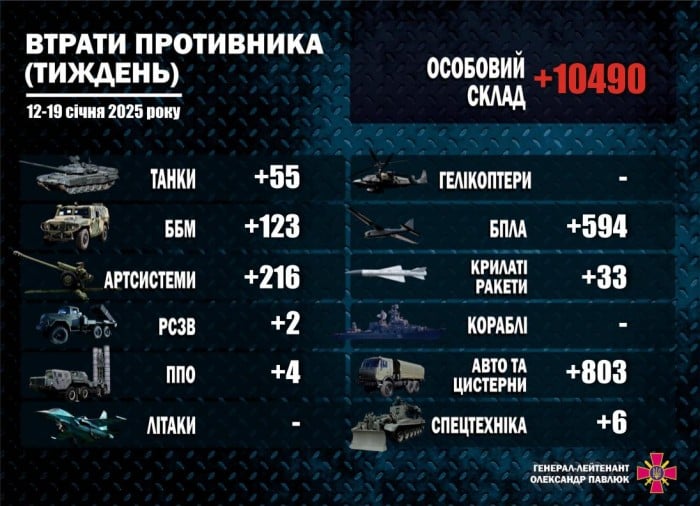 Про це сьогодні, у неділю 19 січня, у своєму Telegram-каналі повідомив генерал-лейтенант Олександр Павлюк.