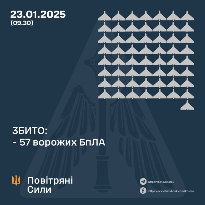 - підтверджено збиття 57 ударних БПЛА типу Shahed та безпілотників інших типів у Полтавській, Сумській, Харківській, Чернігівській, Миколаївській, Херсонській, Запорізькій та Дніпропетровській областях;