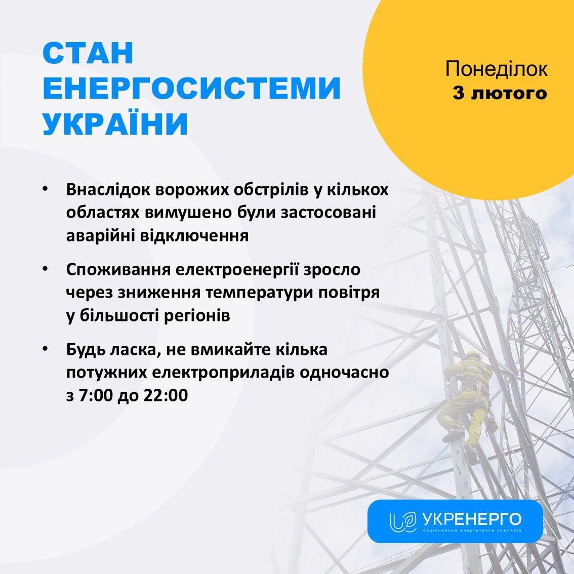 Знеструмлення у Харківській, Сумській, Донецькій, Полтавській, Запорізькій, Кіровоградській областях застосували у понеділок, 3 лютого. Також частково світло вимикають у Дніпропетровській, Черкаській та Київській областях. Про це компанія «Укренерго» повідомила у соцпережах.