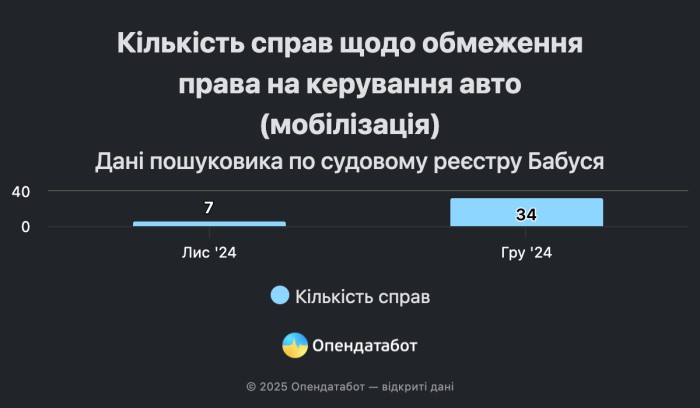 Зазначається, що за допомогою пошуковика по судовому реєстру знайдена щонайменше 41 судова справа, пов’язана з обмеженням права на керування авто через порушення правил військового обліку.