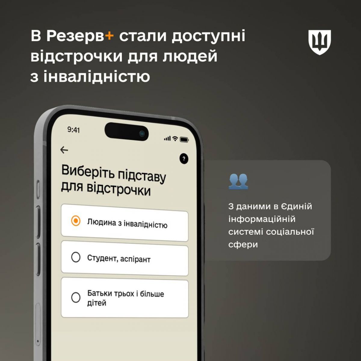 В Україні стали доступні відстрочки для людей з інвалідністю, які можна оформити у мобільному застосунку «Резерв+". Це можуть зробити громадяни, дані про яких є в Єдиній інформаційній системі соціальної сфери. Про це Міністерство оборони 27 березня повідомило у Telegram.