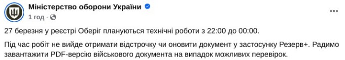 Під час робіт не вийде отримати відстрочку чи оновити документ у застосунку Резерв+. Радимо завантажити PDF-версію військового документа на випадок можливих перевірок, — наголошують у відомстві.