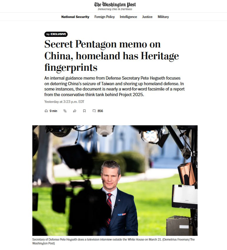Документ, відомий як «тимчасова стратегічна оборонна директива з національної оборони США», має гриф «секретно/без доступу для іноземців» та містить формулювання, що повторюють матеріали Heritage Foundation.