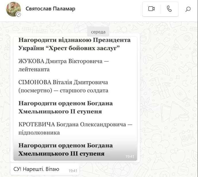 Поки я ще був на службі, командир бригади подав мене на нагороду. Процедура не з простих — тривала, бюрократична, але врешті-решт, через чотири місяці, президент підписав указ про моє нагородження. У середу, 9 квітня 2025 року, друг Калина — заступник командира бригади — привітав мене, надіславши скріншот з офіційного сайту президента, де я був у списку нагороджених, — зазначив він.