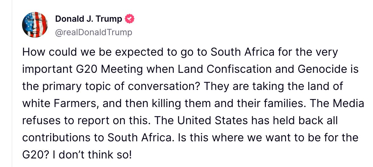 Як можна очікувати, що ми поїдемо до Південної Африки на дуже важливу зустріч G20, коли конфіскація земель і геноцид є головною темою розмови? Вони забирають землю білих фермерів, а потім вбивають їх та їхні сім’ї. ЗМІ відмовляються повідомляти про це. Сполучені Штати зупинили всі внески в Південну Африку. Чи хочемо ми бути саме там на зустрічі G20? Я так не думаю! — заявив Трамп.