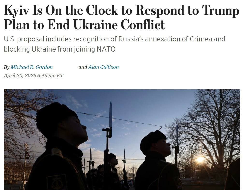 The Wall Street Journal пише, що у документі США пропонують припинити вогонь уздовж нинішніх ліній зіткнення та визнати Крим російським. Також в ньому виключають членство України в НАТО, а територію навколо ЗАЕС пропонують зробити нейтральною, яка могла б перебувати під контролем США.