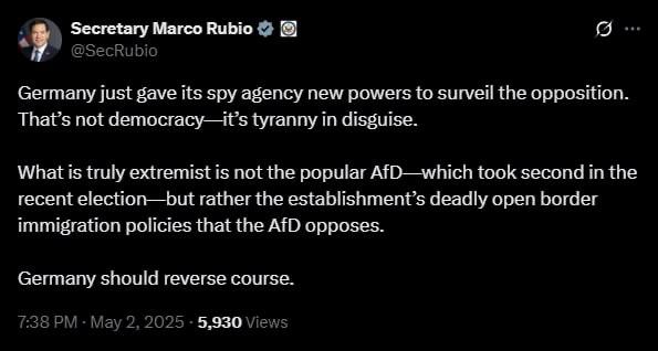 Німеччина щойно надала своїй розвідці нові повноваження для стеження за опозицією. Це не демократія — це тиранія під маскою, — прокоментував Рубіо.