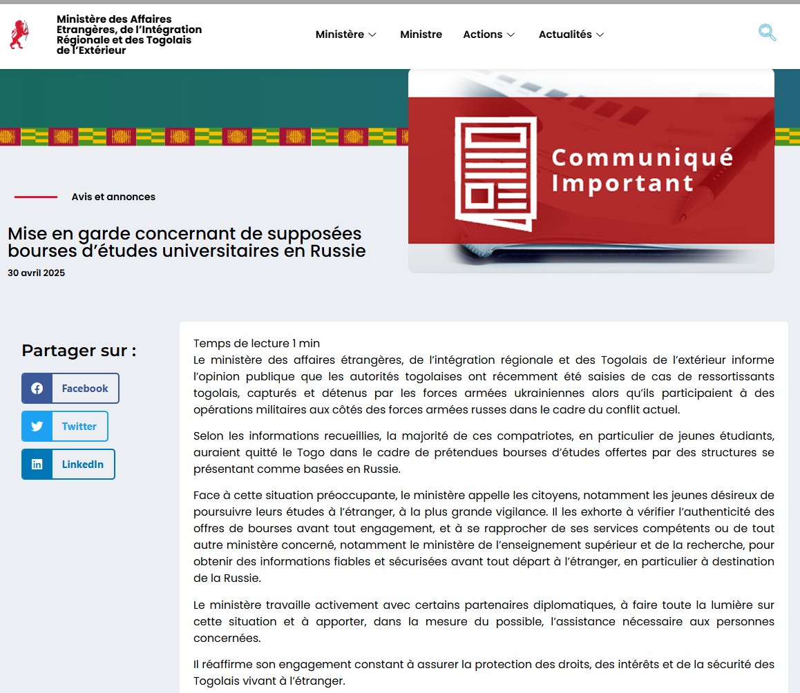 Водночас в Україні про це офіційно не повідомляли. За наявною інформацією, більшість із них — переважно студенти — виїхали з Того нібито за програмами стипендій від організацій, що представлялися як російські.
